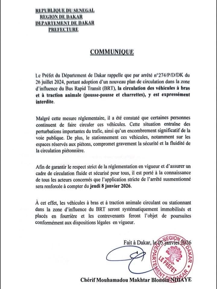 Le préfet de Dakar, Chérif Mouhamadou Makhtar Blondin Ndiaye, a annoncé un durcissement de l’application des mesures interdisant la circulation des véhicules à bras et à traction animale dans la zone d’influence du Bus Rapid Transit (BRT). Cette décision entrera en vigueur à compter du jeudi 8 janvier 2026.