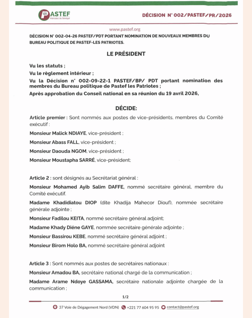 Le président du parti Pastef-Les Patriotes, Ousmane Sonko, a procédé ce dimanche 19 avril 2026 à une vaste restructuration du Bureau politique de sa formation. Cette décision, actée après approbation du Conseil national, marque un tournant dans l’organisation du parti au pouvoir.