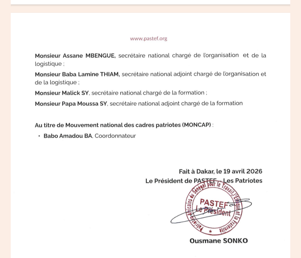 Assane Mbengue prend la charge de l’organisation et de la logistique, tandis que Malick Sy hérite du secrétariat national chargé de la formation. Enfin, Babo Amadou Ba a été désigné coordonnateur du Mouvement national des cadres patriotes (MONCAP).