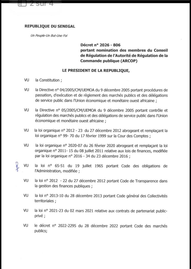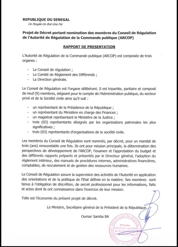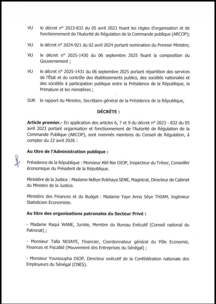 C’est acté. Par décret, le président de la République a nommé les neuf membres du Conseil de régulation de l’autorité de régulation de la commande publique (ARCOP). Issus de l’administration publique, du secteur privé et de la société civile, ils sont nommés pour un mandat de trois ans renouvelable une fois, à compter du 22 avril 2026.